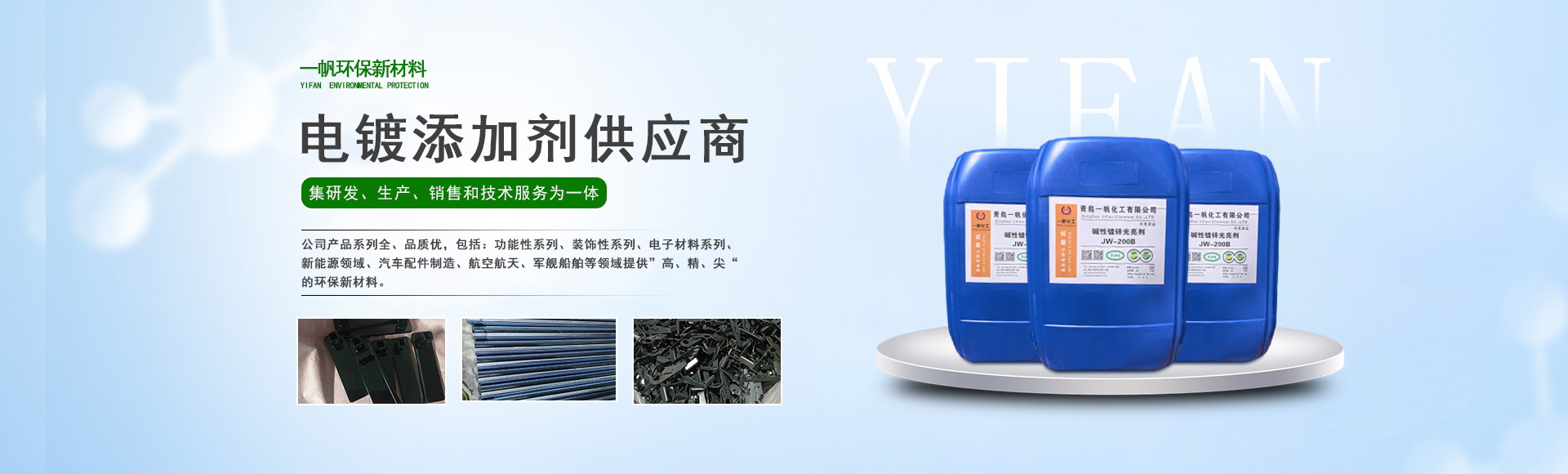 青島一帆環保新材料有限公司主營酸鋅載體、堿鋅中間體等一站式電鍍添加劑服務商!